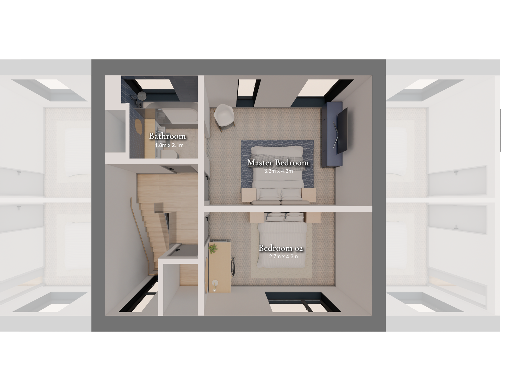 These contemporary terraced houses extend along the right side of the development, each with dedicated parking spaces directly in front. Plot Three is the house in the centre of the terrace, offering a larger open plan living area and kitchen space, with two generous bedrooms, a family bathroom and a lovely private garden, perfect for outdoor living and relaxation.